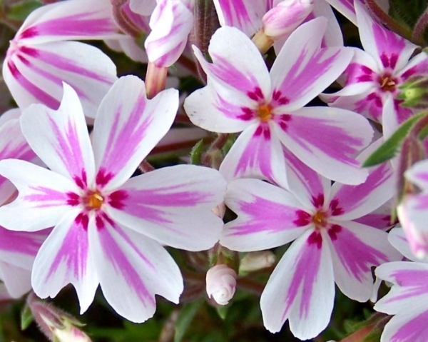 Флокс сорта Candy Stripes (Кенди Стрипс) активно используется садоводами для оформления участков. Цветет растение в мае, июне и июле, этот процесс может повториться и в августе. Цветки по форме похожи на маленькие белые звезды и сиреневатыми крапинками вдоль у каждого лепестка. Стебли флокса короткие максимум 15 см в высоту, покрыты густой листвой. Поздней весной, когда растение покрывается огромным количеством цветочков, можно стать наблюдателем шикарной картины. Сорт Кенди Стрипс не требователен к организации ухода, отлично чувствует себя в обычной почве без застоев влаги и под яркими солнечными лучами. Растение хорошо отзывается на периодические подкормки, особенно прямо перед цветением и в середине июля.