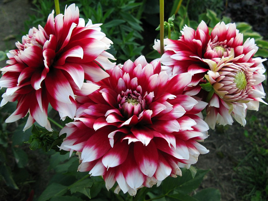 Цветы георгины Сидлер Штольце яркие и крупные, до 13 см в диаметре. У них ярко-бордовая сердцевина, от которой отходят одиночные плоские лепестки с плавным переходом цвета к белому. Цветы полностью махровые и немного отогнуты к стеблю — эта особенность делает соцветия очень пышными.