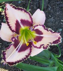 • Окраска цветка : кремово-розовый с лиловым пятном и каймой, горло зелёно