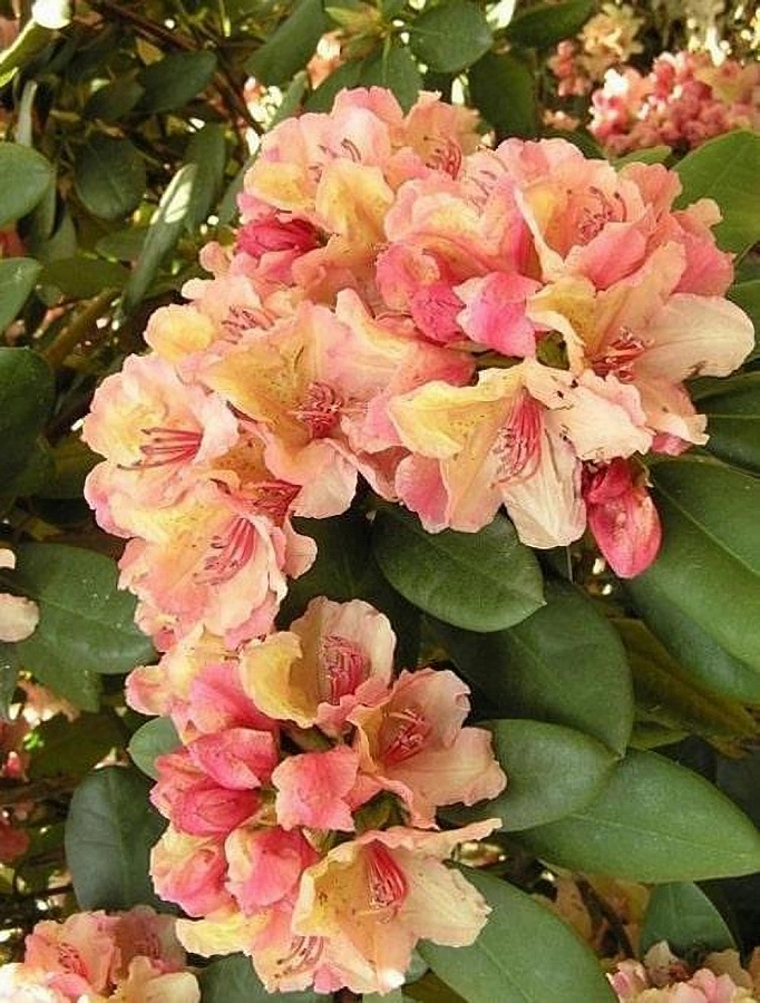 Рододендрон гибридный флаутандо - это великолепное растение с апельсиново-кремовыми цветками, которые привлекают внимание своей нежной окраской. Этот кустарник достигает высоты до 80 см и диаметра до 100 см, что делает его идеальным выбором для газонов, групповых посадок или живых изгородей. Листья растения зеленые как весной, так и летом, создавая яркий контраст с цветами.