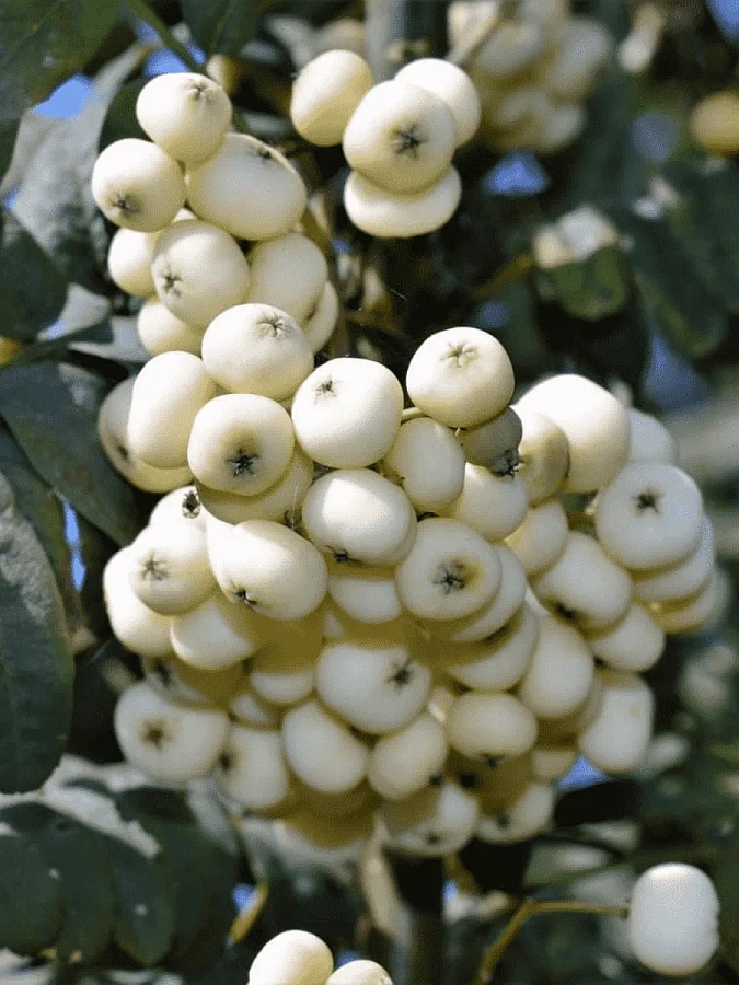 Саженцы рябины плодовой Кашмирская (Sorbus Kashmirskaya) сформируют раскидистое деревце или куст с необычными кистями ягод белого цвета.