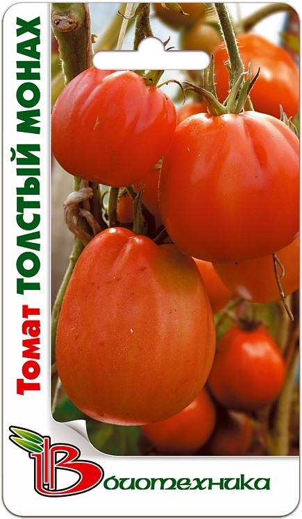Семена томата "Толстый Монах" (Tolstyj Monakh) – это среднеспелый высокорослый сорт. Культура может достигать до 1,5-2 метров в высоту. Созревание наступает через 100 – 110 дней после появления массовых всходов. Сорт отличается высокой урожайностью. На растении вырастает 4-5 кистей, на каждой формируется по 5-6 плодов. Крупные помидоры усеченно-квадратной формы весят 200-220 грамм. Мякоть ярко-красная, сахаристая, мясистая, практически без сока, великолепного десертного вкуса. Урожай рекомендуется использовать для свежего потребления и фаршировки.
