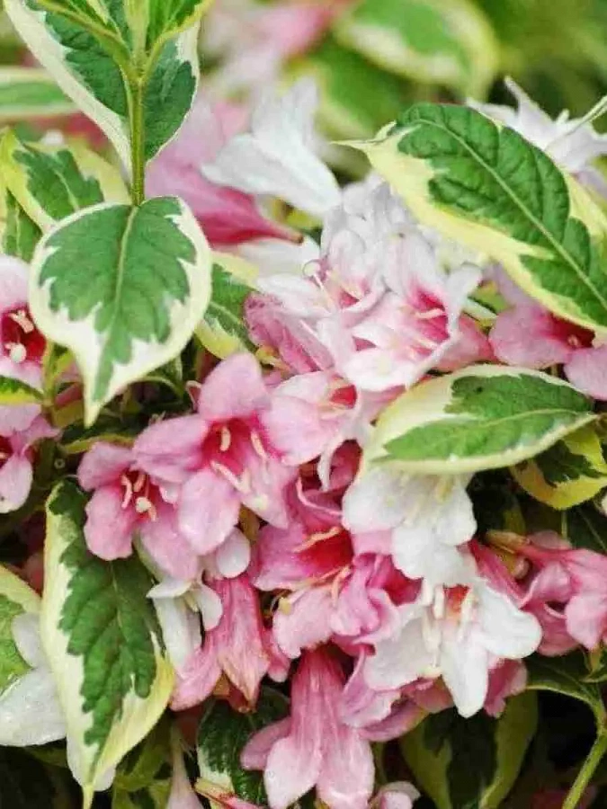 Саженцы Вейгелы цветущей Вариегата (Variegata) вырастают в один из наиболее красивых кустарников в своем роде, благодаря прекрасным бело-розовым или малиновым цветкам, растущим по несколько штук. Отличительным признаком листьев является наличие желтой каемки по краям. Крупномеры растут достаточно медленно и не достигают больших размеров – не более одного метра в высоту. Лучшим вариантом является посадка в садах, в которых преобладает каменистая почва.